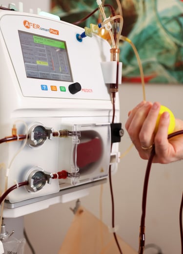 Мы выполняем плазмаферез с двойной фильтрацией (каскадный плазмаферез - DFPP, включая аферез липопротеидов LDL Apheresis) и гемоперфузию в соответствии с немецкими и американскими руководствами по аферезу. Используем современные технологии плазмафереза ведущего европейского производителя Medica S.p.A. (Италия).